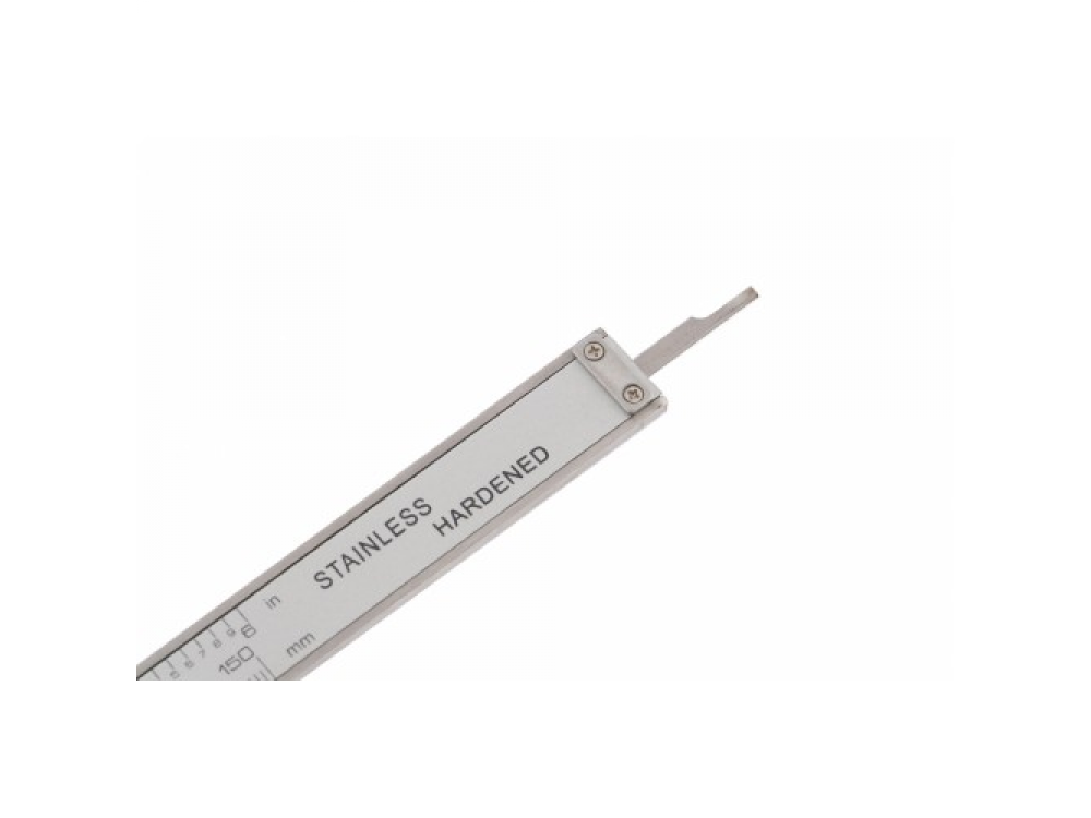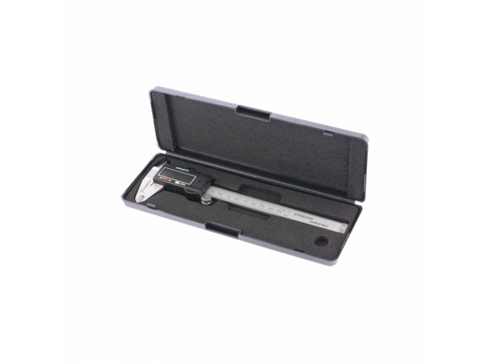 Штангенциркуль изготовлен из инструментальной нержавеющей стали. При перемещении бегунка по профилю инструмента показания измерений отражаются на жидкокристаллическом дисплее. Источник питания – одна батарея 1,5 В, тип SR44. Погрешность измерения 0,02 мм (