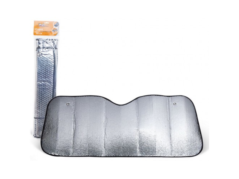 Солнцезащитная шторка размером 60х125 см устанавливается на лобовое стекло автомобиля, полностью изолируя его в этой части от попадания солнечных лучей. Серебристая поверхность изделия из специального материала полностью блокирует проникновение лучей в салон, защищая его от нагревания.